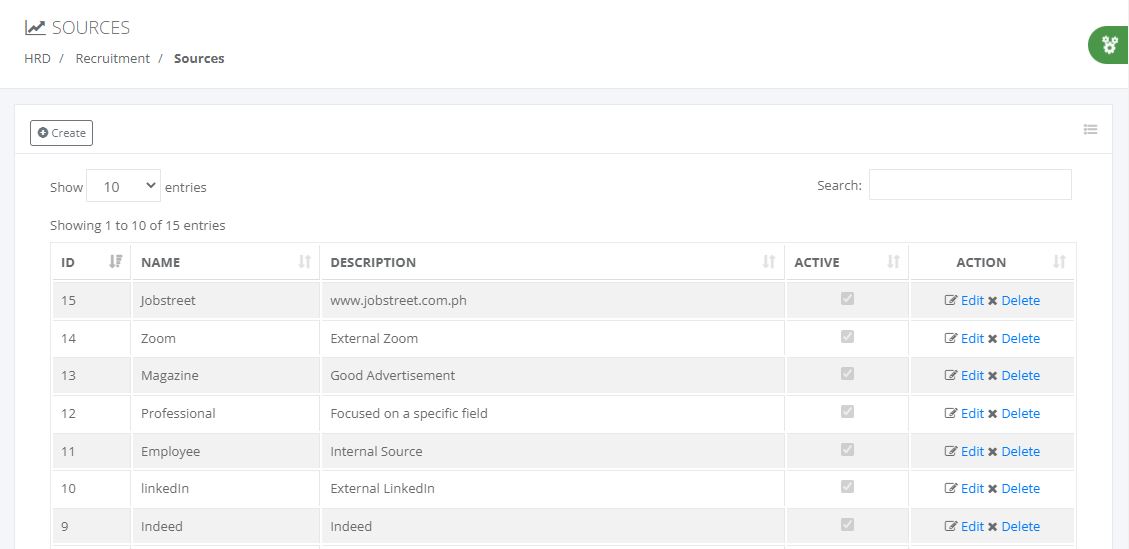 H R D -> Recruitment -> Sources: tools for recruitment staff to add new sources that refer to a job seeker or finding potential employees to hire coming from different sources like social media, jobstreet, indeed, walk-in applicants etc. This information is used in creating a new applicant data entry, which is a dropdown list for Applicant Sources. (see screenshot below)