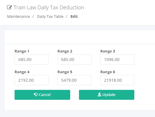 Maintenance -> Train Law -> Tax Daily: Bureau of Internal Revenue (BIR) Daily Rates of Tax on Taxable Income of Individuals. The employee tax deduction shall be computed in accordance with the provided tax computation table.